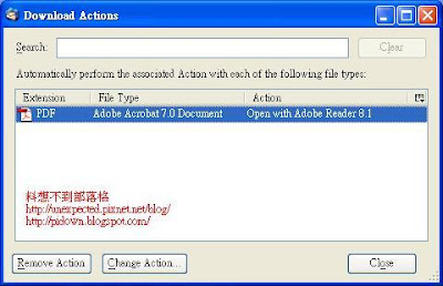 4.點選後會跳出設定視窗,視窗中會存有之前您已經設定好的預設動作的檔案格式,您可以透過此視窗變更之前的設定,或移除設定回到預設值,跳出視窗來詢問你。