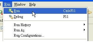 接下來就是要執行程式了,進入Eclipse平台,選取選單「Run」中的「Run」選項,來執行應用程式。如圖69所示。