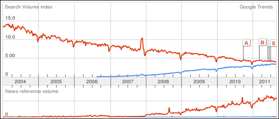 由 google trend 的趨勢圖可以發現,使用 jQuery 的使用人數也持續上升,我比較了 jQuery 與 Javascript 的搜尋得到以下的結果 ( jQuery 是 2006 開始的) 我們發現 jQuery 的查詢量已經快要超越 javascript (紅線) :