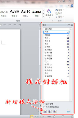 Word 2010【常用】索引標籤→「樣式」按鈕群組,點擊右下角的小按鈕圖。可以開啟樣式對話框。方便建立、套用及修改樣式....