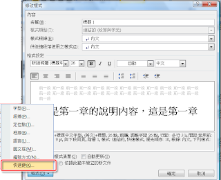 在定義樣式格式中可以設定快速鍵。
