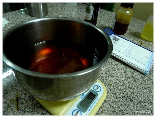 然後待油及氫氧化鈉皆冷卻後,將氫氧化鈉溶液緩慢倒入,並攪拌,讓它們均勻混合...