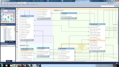 這圖就更清楚的顯示了, 資料表 (Table, 即頂端是藍色那些方塊) 間的關係, 這種關係是建立在不同資料表中的資料欄 (Field) 的關聯. 在上圖中以橙色所標示的關係是一種"一對多(One to Many)" 的關係. 左手邊的資料表 <tbl_company> 是用來記錄主公司的資料, 而另一邊的資料表 <tbl_mvoucher> 則是用記錄所有傳票的主要資料. 其中關聯的資料欄分別是 <tbl_company> 的 <<id_company INT>> 及 <tbl_mvoucher> 的 <<co_mvoucher INT>>, 而該關聯的性質是一對多. 形象化一點說明: 在這個關係中, 主公司的編號 (ID) 在 <tbl_company> 只會出現一次, 但是在 <tbl_mvoucher> 則可以出現無數次. 情況就如同, 一間公司可以有無數多張傳票 (Voucher) .