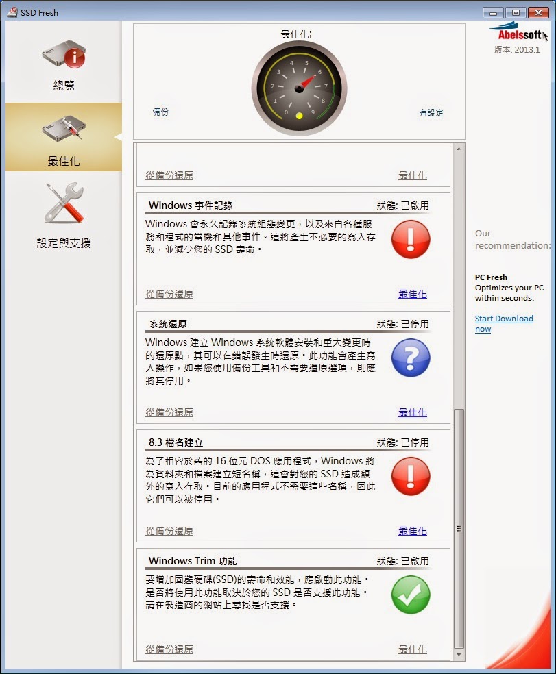 <span style="font-family: Arial, Helvetica, sans-serif, 新細明體;">▼ 出現幾個需要最佳化的選項,按最佳化的連接就對了,像磁碟索引只會減少SSD的壽命,所以關閉磁碟索引功能比較好。</span>