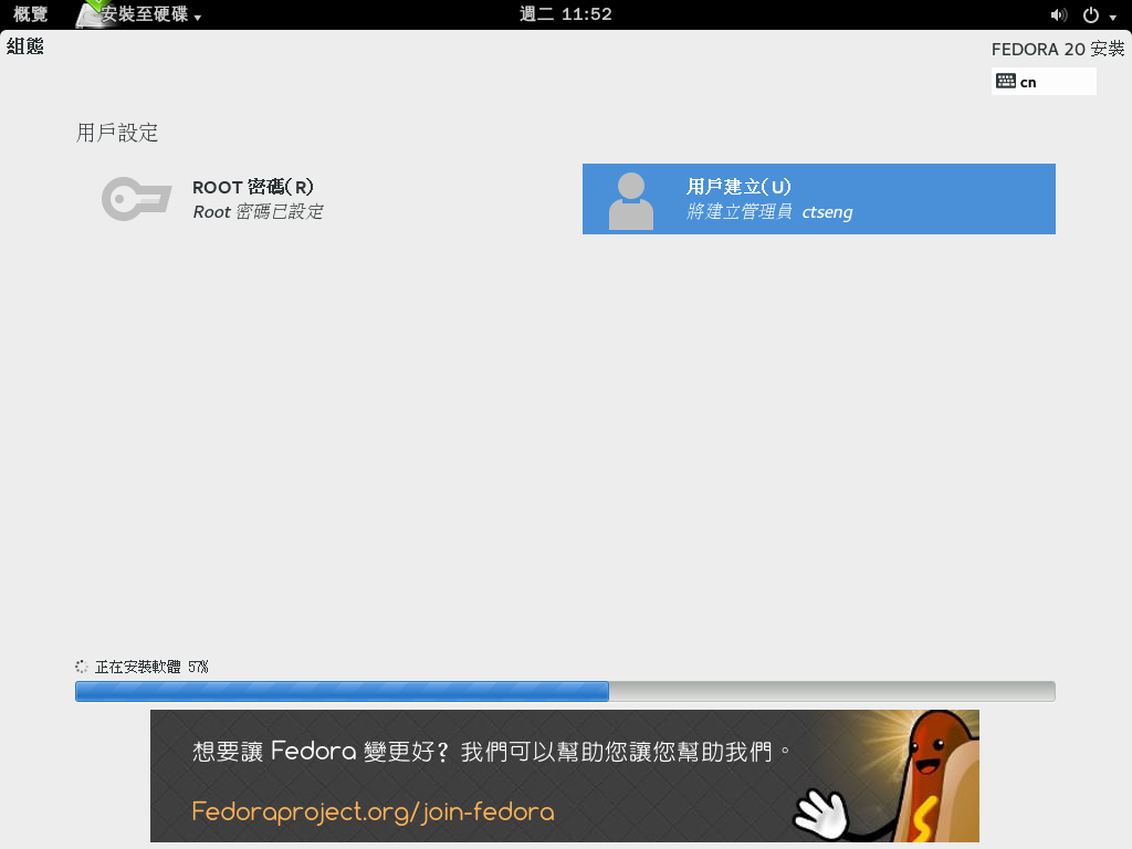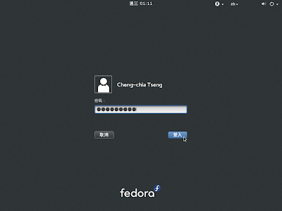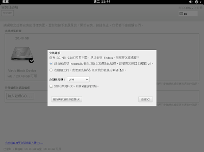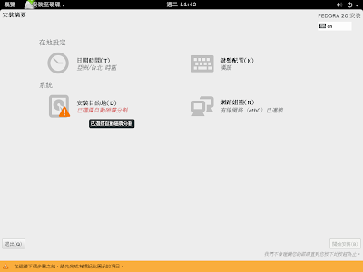 原 來是詢問說是否要將標準資料夾的名稱改用現在的語言,不過此項設定只會影響 Live 媒體的作業階段,不會影響到安裝後的系統,因此點按哪個選項都沒有關係。值得注意的是,若以中文安裝 fedora,系統會自動幫你的標準資料夾設為中文。隨意選好後,我們就將 fedora「安裝至硬碟」吧!