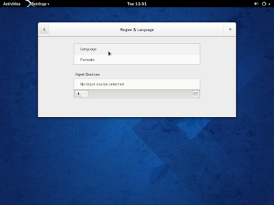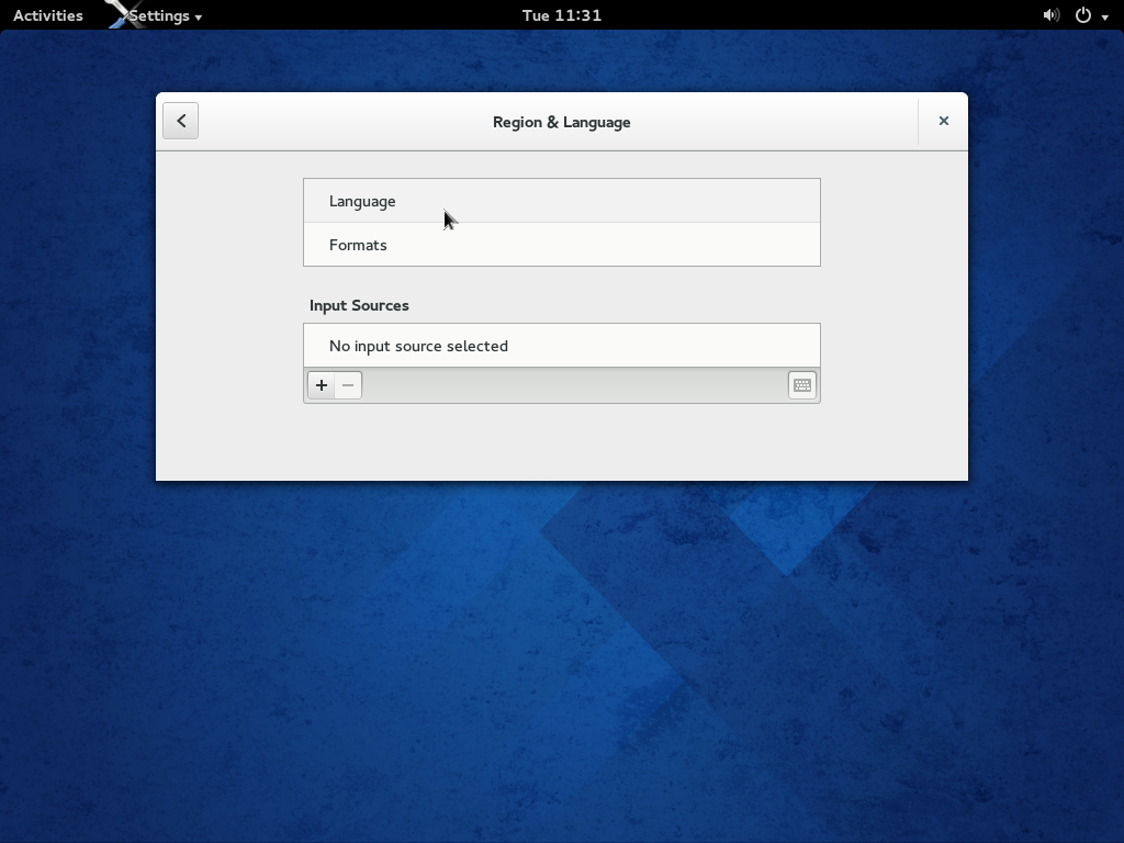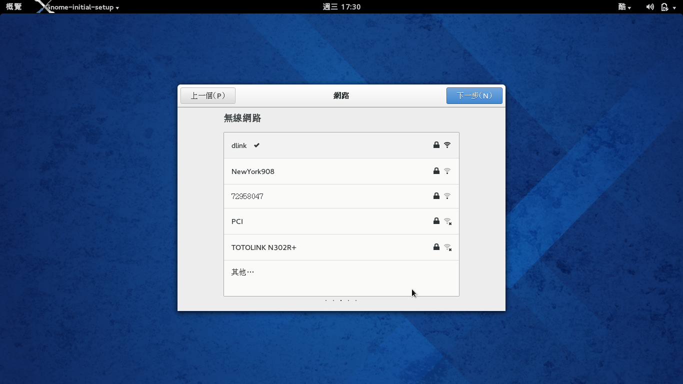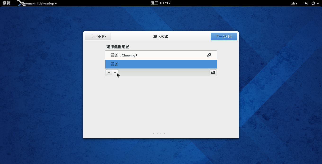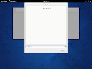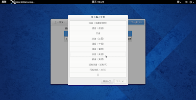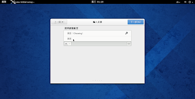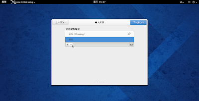 初次登入時,Gnome 會帶你走過初始設定,首先選取界面語言。由於安裝時我們採用中文介面安裝,因此 fedora 會先幫我們選好漢語 (臺灣) 這個語言,只要往下拉動捲軸就能看到。