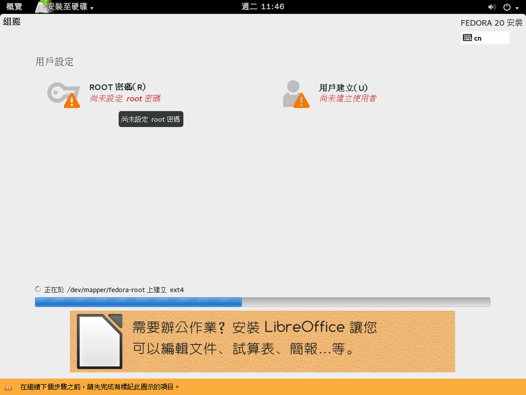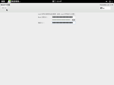 安裝程式要求設定 root 密碼,以及建立使用者。我們先來設定 root 密碼。