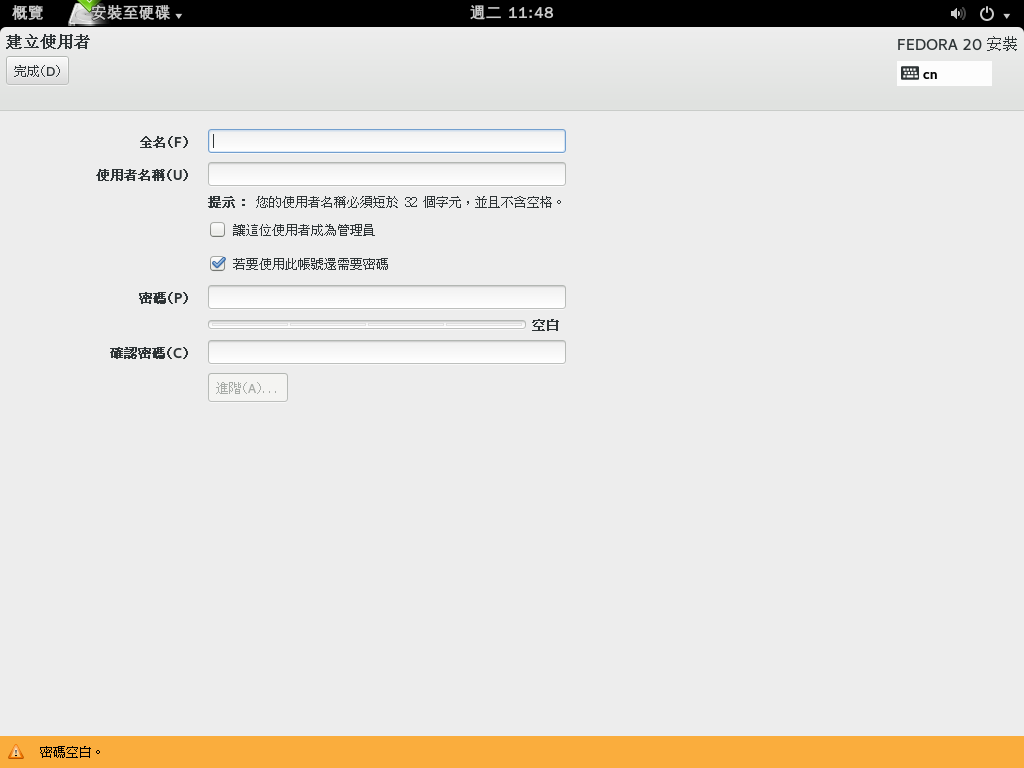 全名部份可以隨意打,由於我們剛剛在地區和語言設定中沒有設定中文輸入法,因此這裡僅能輸入英文。但安裝完成後,使用者的全名可在右上角的整合式選單 > 工具圖示按鈕 > 系統 > 使用者 中更改,因此別太擔心只能使用英文的困境。