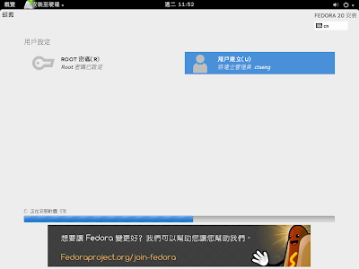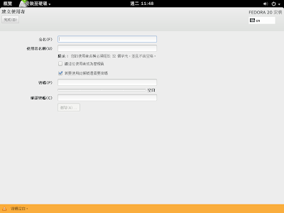 再來設定往後使用 fedora 時要登入的一般使用者帳號,請點按「用戶建立」。