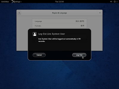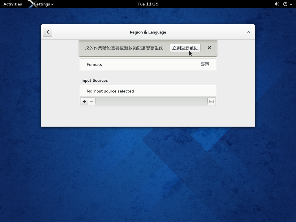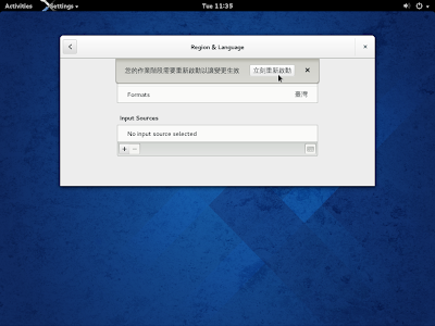 設定好語言後,系統會詢問你是否要重新啟動作業階段以採用漢語 (臺灣) 的語言介面,就點按「立刻重新啟動」。
