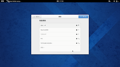 至 於網路組態,本指引安裝時是採用虛擬機環境,有自動設好 eth0 的有線網路,所以無須再設定。對於一般人而言,網路設定其實無關緊要,它只是提供一些軟體更新的手段,例如更新這個安裝程式、某些內含軟體之類,但其實沒 有特別需求的話,我們也不必在安裝階段開啟網路處理。值得注意的是,如果你這時設定的是「Wifi 無線網路」,安裝程式會自動將基地臺名稱與密碼記憶下來,安裝完後就能直接使用。因此網路組態是否要設定,端看個人需求處理即可。