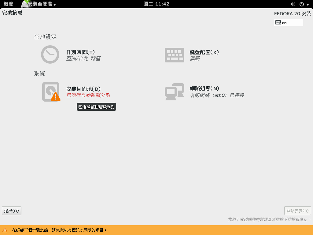 由於本指引安裝時採用虛擬機環境,因此磁碟空白尚未設定,安裝程式可自動處理磁碟分割,無須煩惱其他細節,我們這裡直接按下「繼續」回到安裝摘要的主畫面。