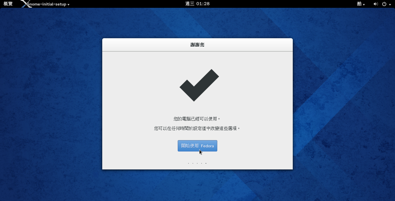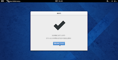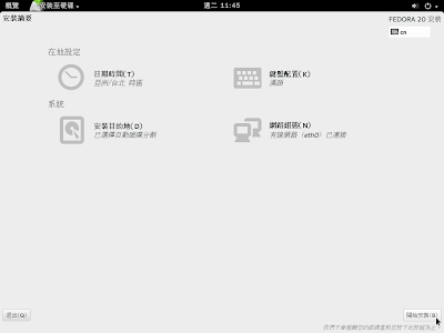 安裝完成,點按「退出」鈕離開安裝程式,接著重新開機就能進入 fedora 20 的世界中囉!