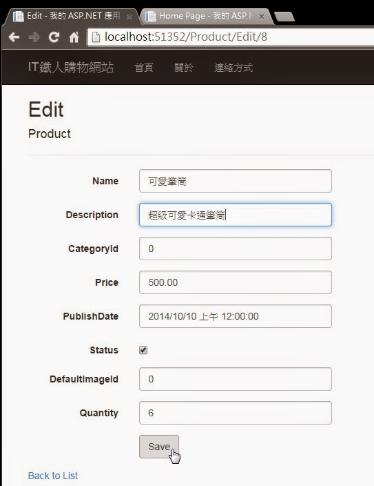 這樣就完成了Product的編輯功能囉,明天我們繼續實現Product的刪除功能。