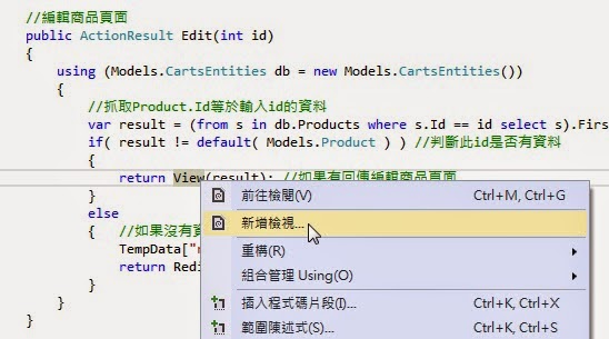 3. 準備加入Edit頁面,在View()按下滑鼠右鍵,點選[新增檢視]