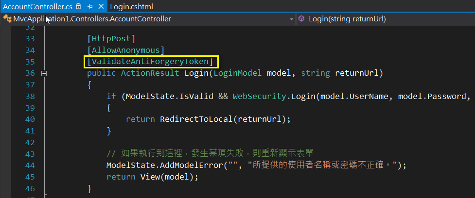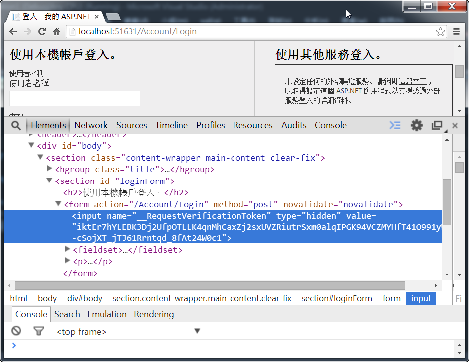 其中14行的**@AntiForgeryToken**要搭配Action設定,這樣在登入畫面時會產生一個隱藏的input值,預防跨網站攻擊