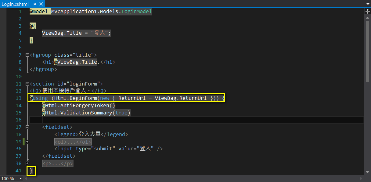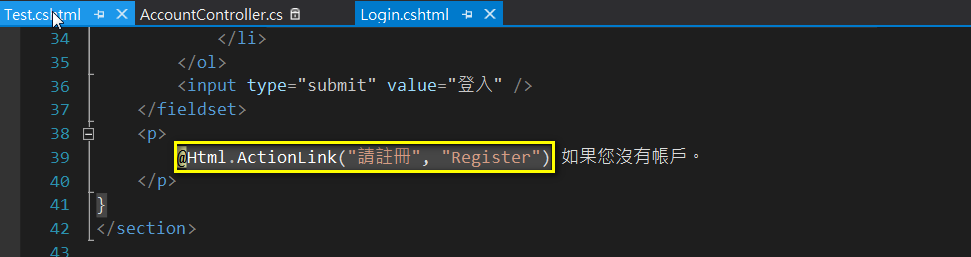 透過預設範本的Views/Account/Login.cshtml來觀察這些方法是如何使用的