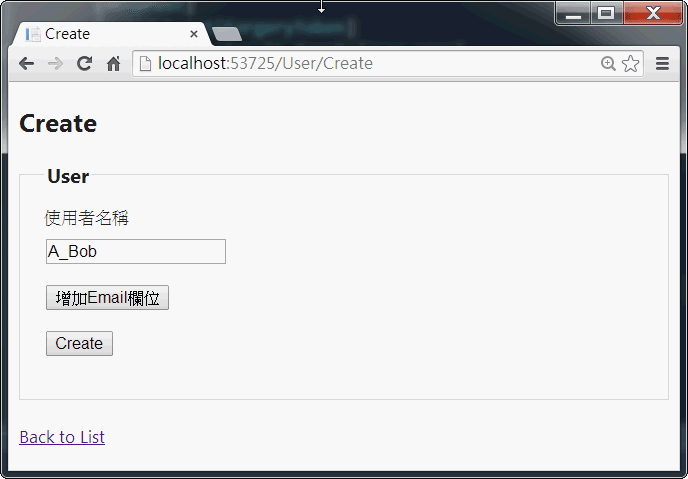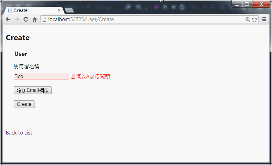 如果今天想在使用者輸入非A開頭的帳號時,直接幫他加上A_這個字串讓他可以直接新增的話要怎麼做呢,例如下圖,讓使用者輸入Bob按下Create按鈕時,停留在原畫面並將Bob改為A_Bob