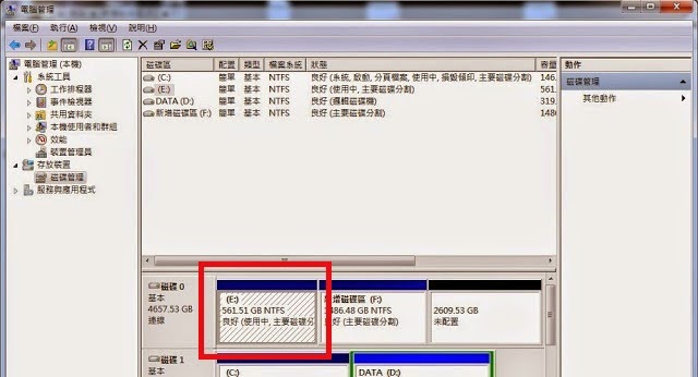 ▼ 特別注意的是,大容量硬碟在較早期的主機板,並無法使用到完整的容量,如下圖的磁碟0的第一個NTFS分割只有561GB。而且在使用MBR方式實際切割時,每個分割區也只能切割出2GB,這樣一來這顆5TB的硬碟就會一分為三,增加管理上的複雜性。