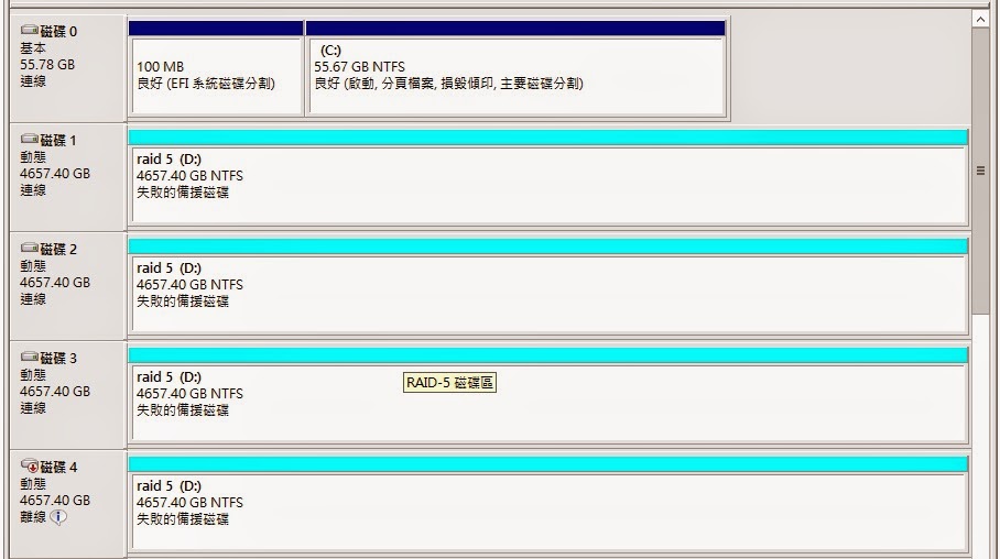 ▼ RAID-5磁碟即顯示無法備援的磁碟,即此RAID-5磁碟失去了容錯能力,亦即再多損失一顆實體磁碟,內存的資料就掰掰了。無容錯RAID-5,只有合併磁碟機容量的功能,其用途與RAID-1類似。