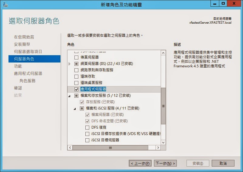 ▼ 針對每一個選取的伺服器角色,選取對應的角色服務。例如下圖即為針對應用程式伺服器安裝的角色服務。再按下一步即可開始安裝。