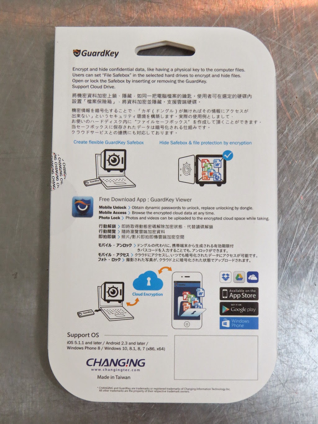 ▲盒裝GuardKey的包裝背面,同樣也有英文、中文、日文三國語言簡易說明!並有提示可以自行下載Guardkey Viewer行動app。並支援iOS 5.1.1以上、Anroid 2.3以上、Windows Phone8、Windows 7、8、8.1、10的32位元與64位元版本。
