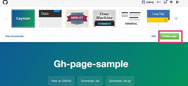 然後,系統會產生預設的樣板以供選擇,因為這些自動產生的網頁等一下都要刪除,所以這裡直接按下「Publish page」綠色按鈕,讓它發佈預設網頁。網頁發佈之後,其網址可用下格式存取: