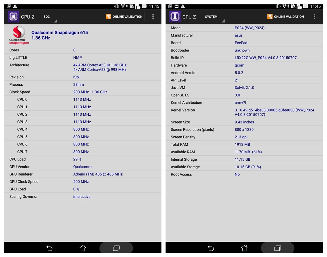 ▲ ASUS ZenPad Z380KL搭載的高通Snapdragon 615,是一顆專供高階行動裝置使用的處理器,架構上共有八個64位元的ARM Cortex-A53核心,其中四個最高時脈為1.36GHz,另外四個為較低的0,998MHz,時脈可以在0.2到1.35GHz間動態調整,是一個在電力與效能間的絕佳平衡設計。GPU渲染器採用Adreno 405,時脈最高為465MHz,總記憶體顯示為1912MB,評測機出廠為內部儲存空間16GB的機台,可用為11.15GB,剩餘10.15GB。