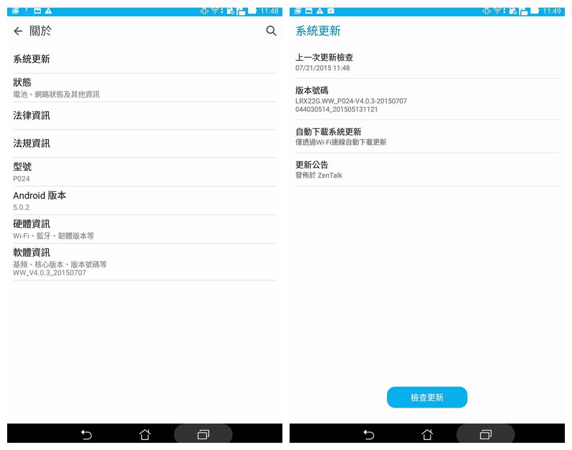 <span style="font-size: 4;">▲ ASUS ZenPad Z380KL的編號為P024,Android版本為5.0.2的Lollipop,本文評測使用LRX22G_WW_P024-V4.0.3為測試標的。而在「關於」內的Anroid版本字樣上連點,可以進入Lollipop的彩蛋。