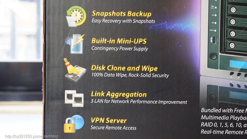 外盒正面,列出了Thecus N5810 Pro NAS四大特點,包括支援從Snapshot還原、內建Mini-UPS不斷電系統、提供硬碟Clone與Wipe功能、並可使用網路聚合功能把最多五個Gigabit網路埠組合使用。