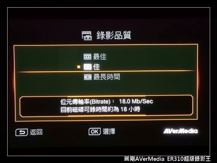 ▲ 壓縮率適中的是次佳錄影品質,bitrate達18Mbps,可錄製時間在140GB的硬碟機上小幅上升為18小時。