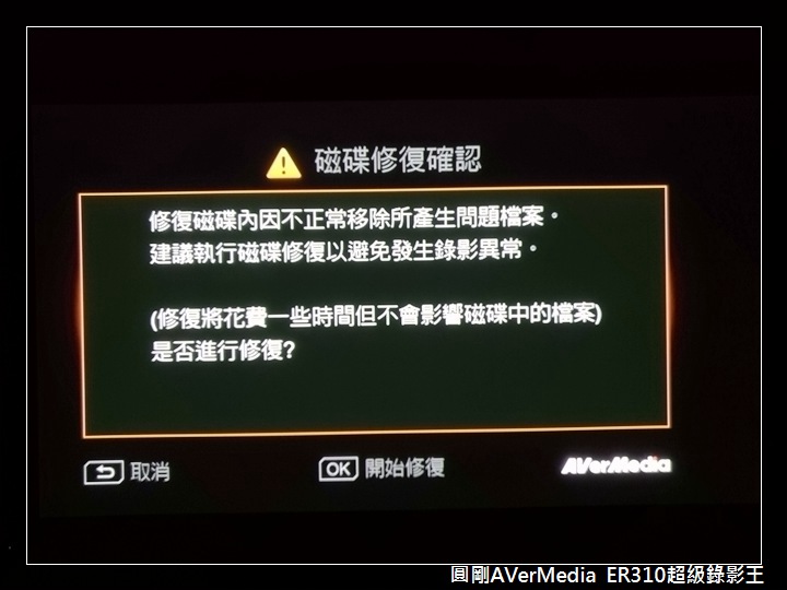 ▲ 無論是內接或外接式硬碟機,如果不正常關機、或者不正常移除,建議使用ER310的磁碟修復功能,以避免錄影時發生磁碟存取的錯誤。