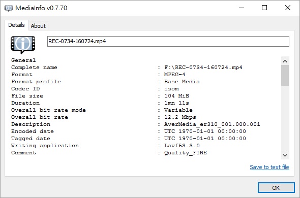 ▲ 使用MediaInfo查看MP4錄製檔的第二頁,針對視訊部分解析,Codec使用相同於MOD電視頻道相同的MPEG4 AVC,也就是H.264 High Profile。