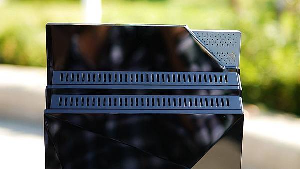 我們看到這樣的塔型及黑色鏡面多邊角設計,優點是省空間不會卡到其他物品,缺點則是易沾灰塵。