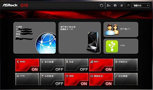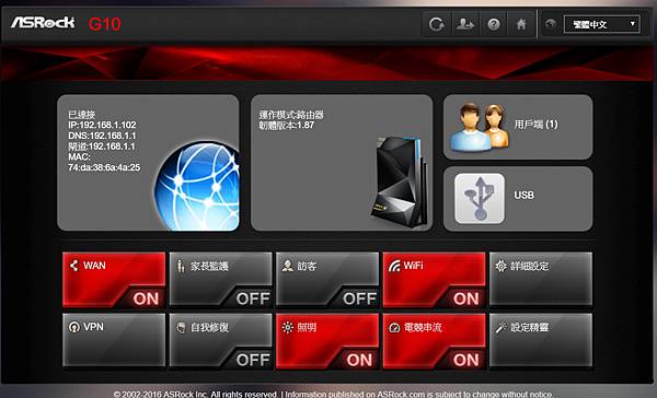 最後的電競串流(GAMING BOOST電競最佳化)跟紅外線操作家電的功能都是不錯有創意的功能,ASRock G10 Gaming Router以AC2600無線網路規格,提供4-Stream最高速1733Mbps傳輸能力,設定頁面也具備視覺化操作容易上手,以上這都可以看到華擎的用心。