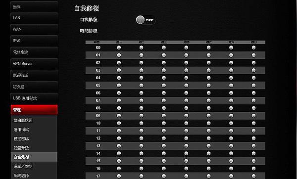 自我修復簡單檢就是自動重開機,一般路由器都是放著不會關閉,開機時間久了都會有一點小問題(如:效能變差),這時就要進行重開機,只要設定好時間,教給機器自動處理即可。