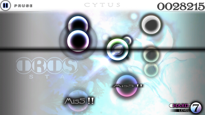 ▲ 音樂手機遊戲《Cytus》的玩家需要隨著音樂節奏,隨設遊戲介面中上下移動的掃描線,準確地點擊對應按鈕:點擊音符(Click Note),長按音符(Hold Note)和拖動音符(Drag Note)。
