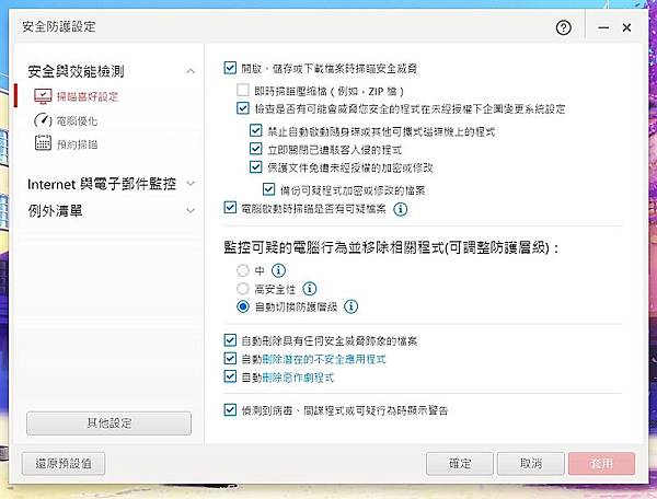 安全防護設定裡,可以看到跟掃描有關的細項設定。其中也可以設定偵測出惡意程式或病毒時要步要自動幫你刪除。