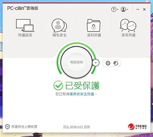 這是大家熟悉的PC-cillin 2017雲端版的介面,主要可以分為四大類功能,,在看四大功能之前,我們先來看一下設定有什麼選項可以調整。