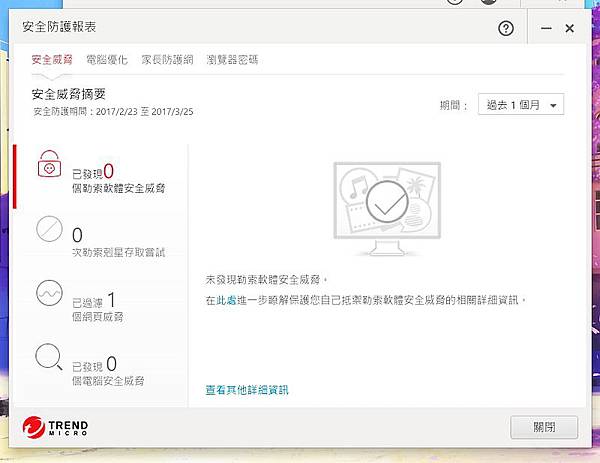 這邊可以看到一個月來的防毒相關報表,檢視你遭遇威脅的次數。