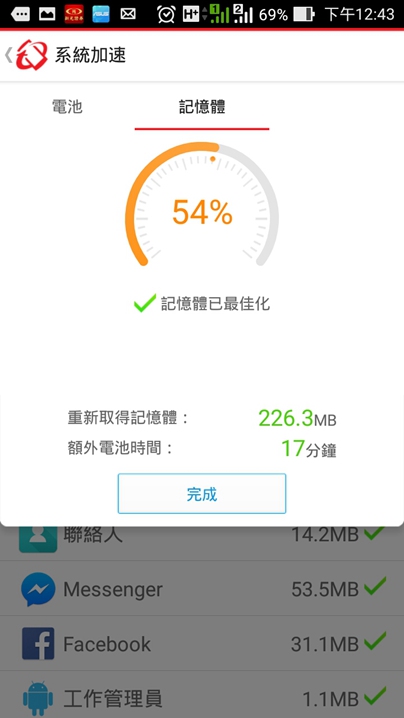 ▲ 原本的記憶體使用率為72%,經優化後釋放226MB,達到54%,並藉此爭取了額外17分鐘電池續航力。