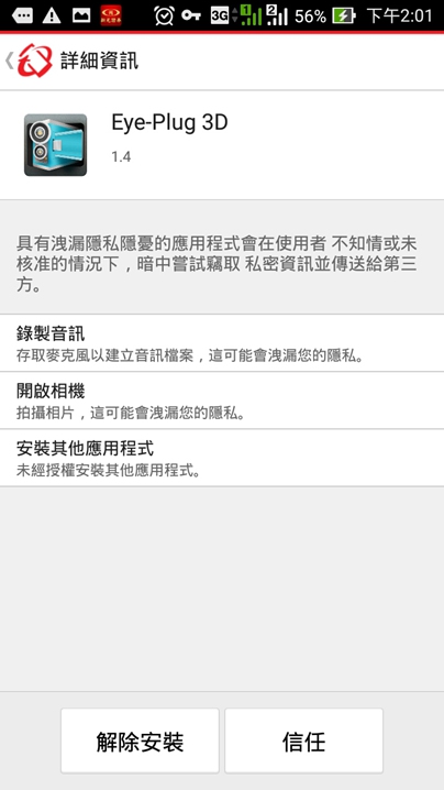 ▲ Eye-Plug 3D因為獲取相機與麥克風使用權限,所以洩漏隱私的疑慮,但由於筆者知道他是來自可信任的硬體開發廠商,故可以按下信任放行。
