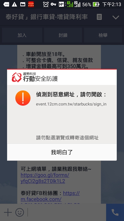 ▲ 剛安裝完畢,就在LINE上面攔截到一個惡意的廣告網址。
