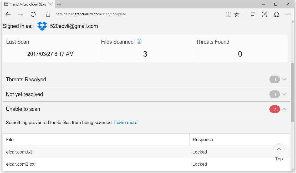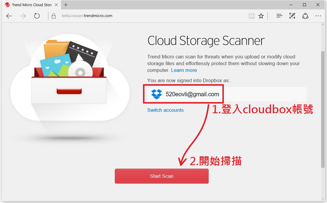 ▲ PC-cillin 2017雲端版支援掃描onedrive與dropbox的儲存檔案,這個功能稱之為Cloud Storage Scanner,目前僅有英文版,故以下略加註明操作方式。