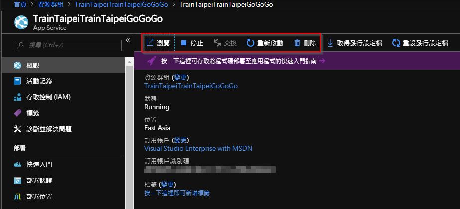 接著右上角小鈴鐺就會出現「部署正在進行中...」,差不多 30 秒,很快架好一個 Web 應用程式。 (資源群組的視角)