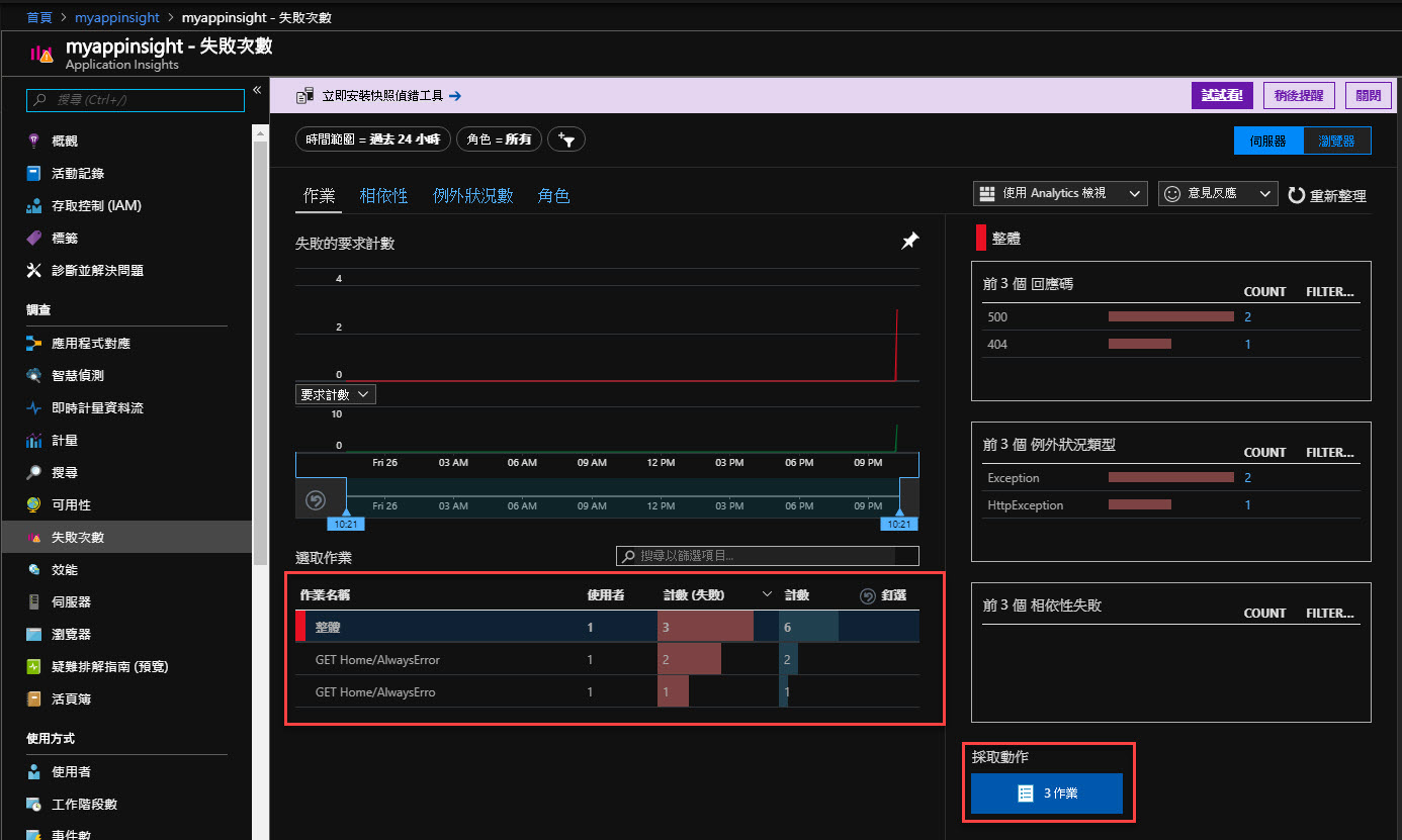 經過我故意用出的錯誤,可以看到有 3 個錯誤,一個是我打錯網址,一個是我故意發生錯誤的 Action ,採取動作 裡面可以看到更詳細的資訊