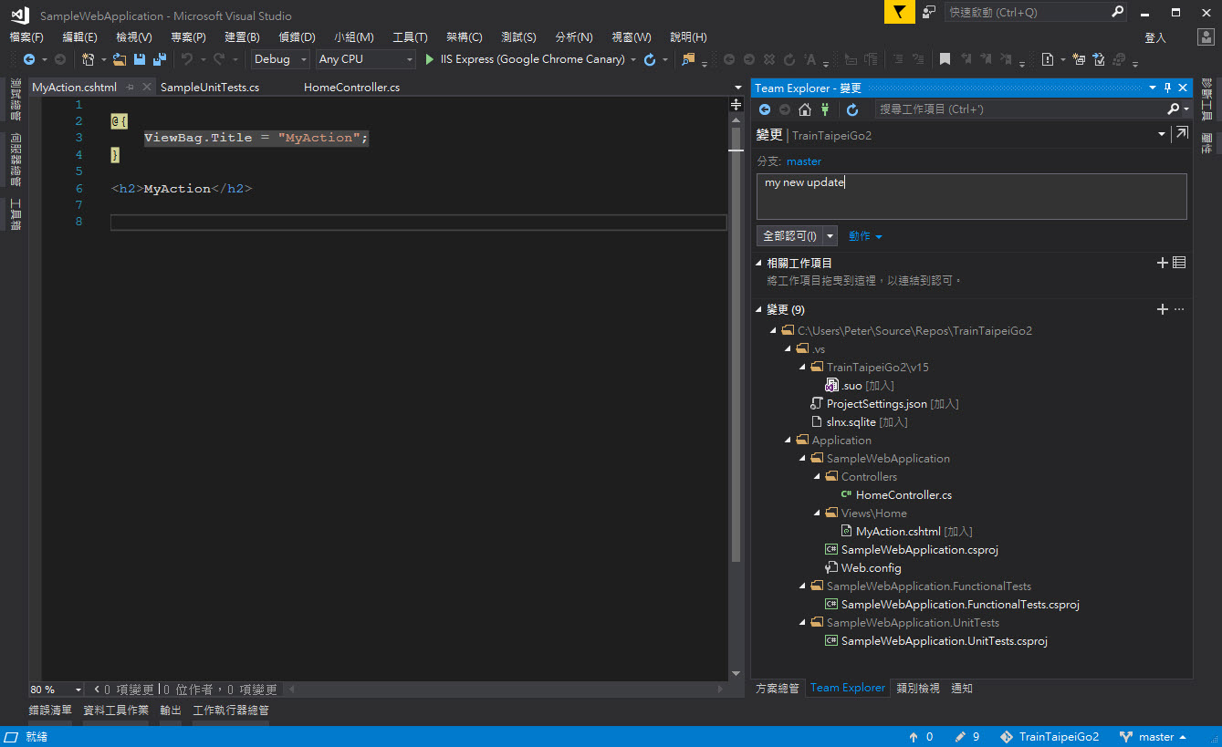 Git Clone 或是直接 Clone in Visual Studio 都可以,我 Clone 下來之後建立了一個 MyAction 的 Action 跟 View 再 Push 到我的 Azure Repo