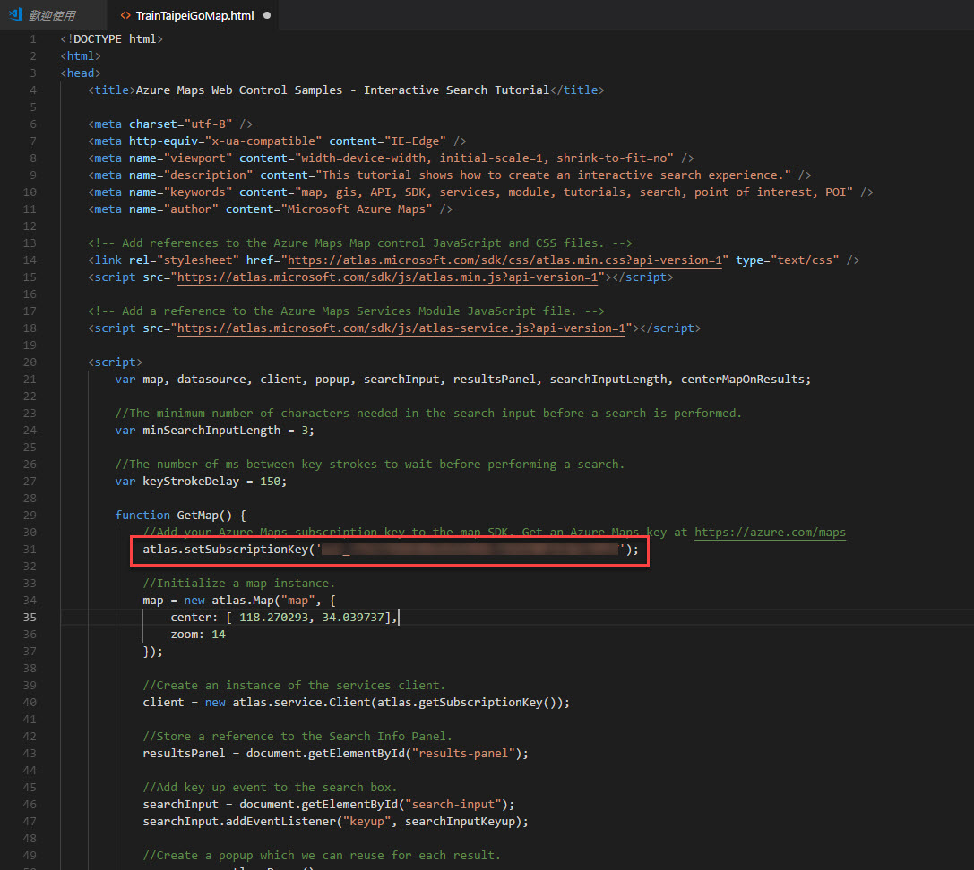 接著要示範的是文件上面的範例。 下載這個 HTML 然後把剛剛的 Key 貼到指定的地方(如圖)。