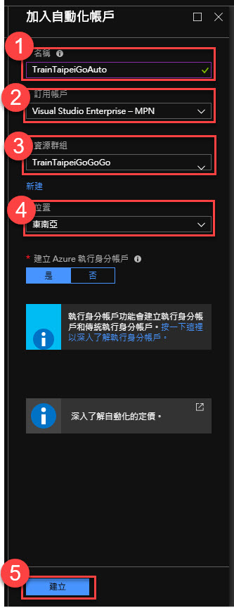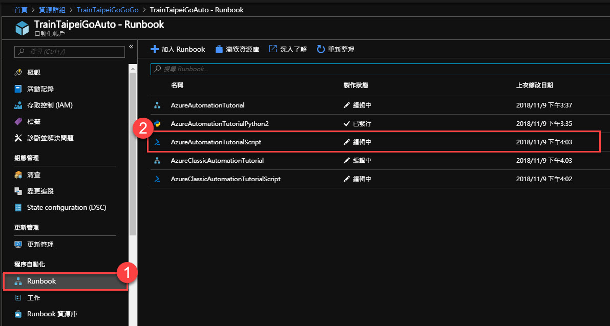 - 建立好的時候,他會給我們五個示範的範本,我這邊選 AzureAutomationTutorialScript 當作示範