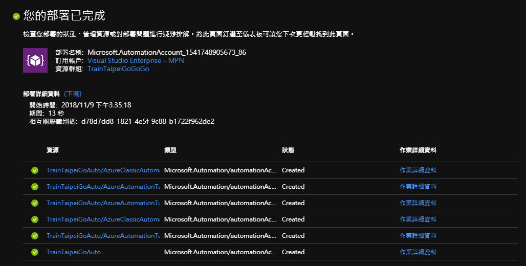 - 這個部分主要你可以寫你的需要自動化的程序的 Powershell Script,這邊這個代碼主要是顯示你所有的資源群組,跟資源群組下的資源名稱跟資源類型。